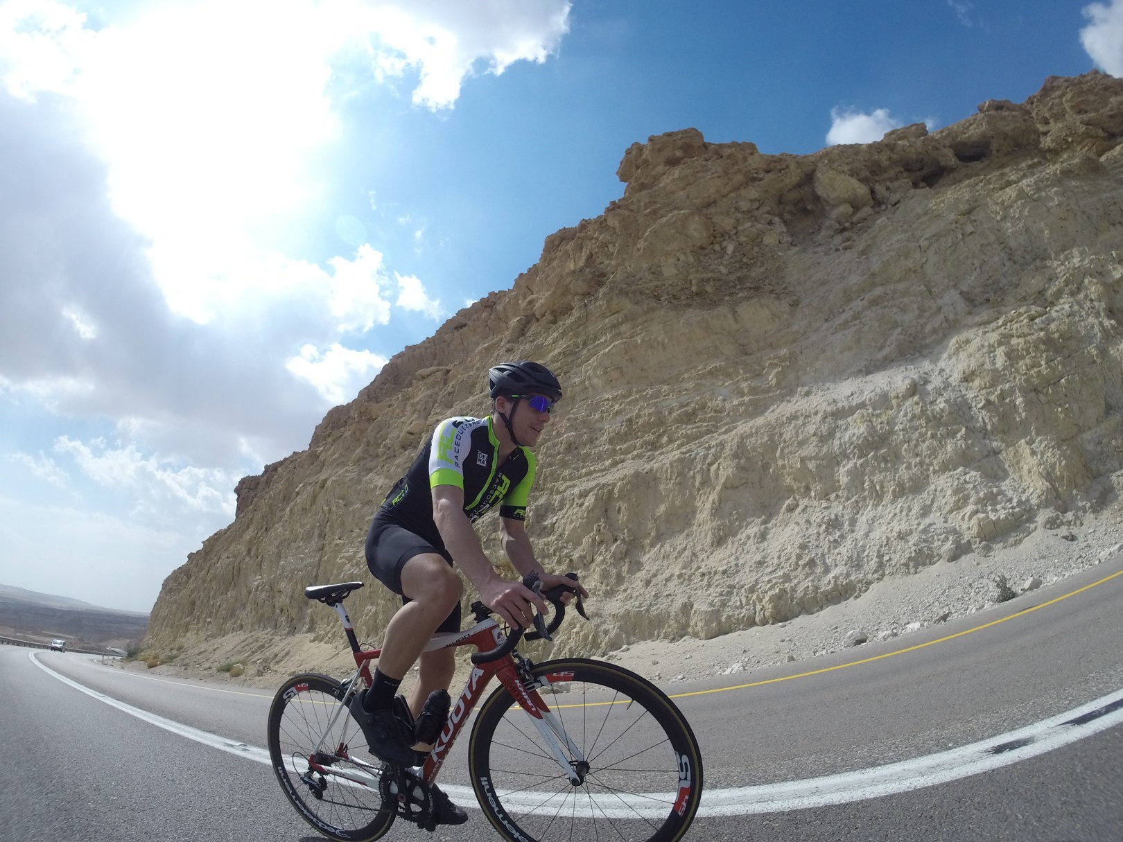Il sabato siamo stati invitati, dall’organizzatore della competizione, a partecipare alla Gran Fonde del Mar Morto, tappa conclusiva della tre giorni denominata Tour of Arad. È stata occasione per provare sulla nostra pelle la difficoltà del competere nel deserto. Il percorso prevedeva inizialmente 60km circa di strada prevalentemente pianeggiante. Sulla carta solo un “trasferimento” verso la seconda parte del percorso invece, grazie al costante ma non fastidioso vento, si è rivelata più dura del previsto, contribuendo da subito a “spezzare” il gruppo dei partecipanti.
