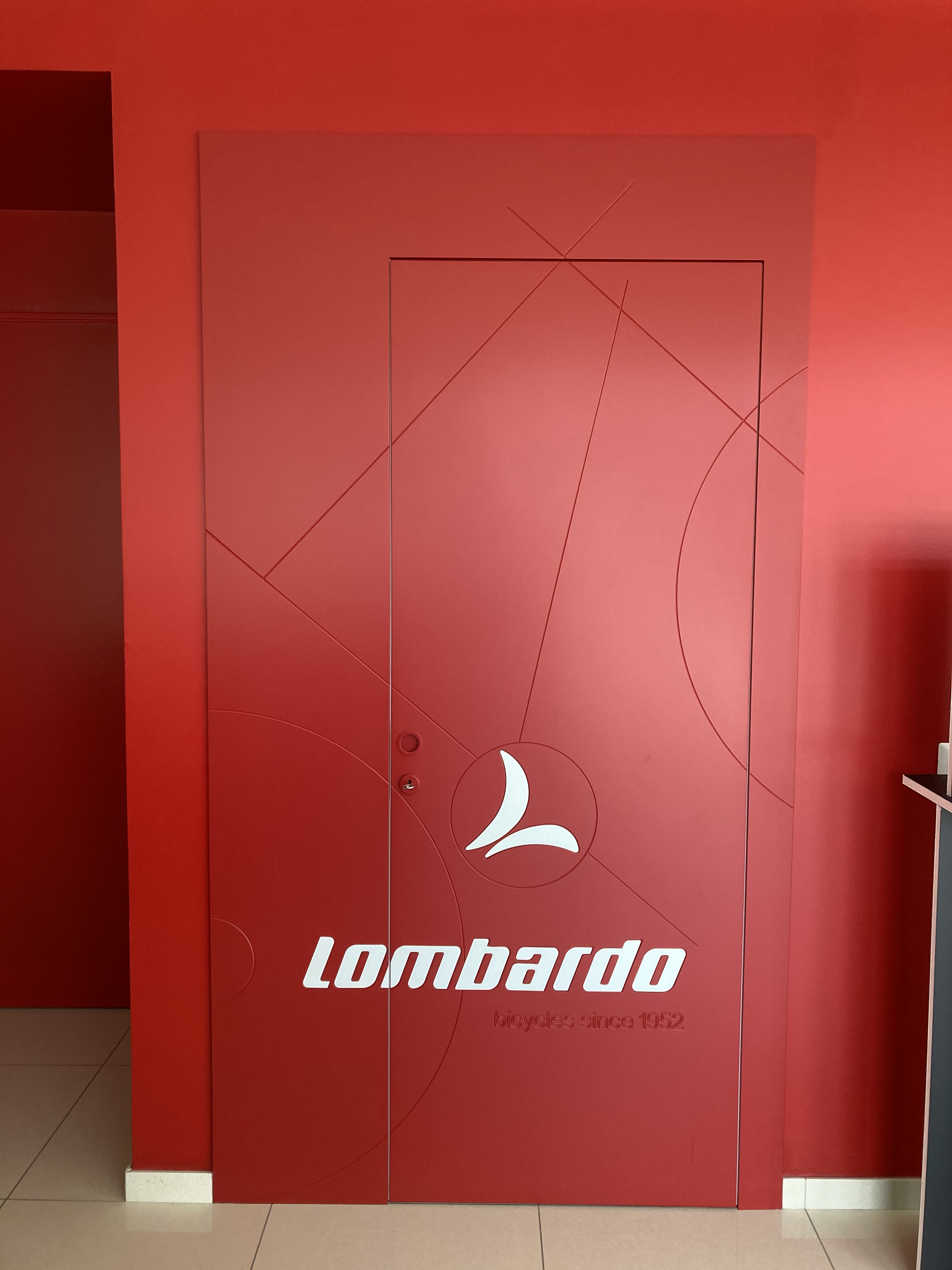 Entrando i colori dell’Azienda, il rosso e il logo, sono motivo decorativo per pareti e porte. E subito vicino all’entrata, si trova una piccola esposizione di bici che ripercorre la storia dell’azienda.